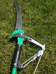 Pole pruners are used for the out-of-reach branches, and when the branches are a little larger, saw blades can be fastened directly to the pruning head.